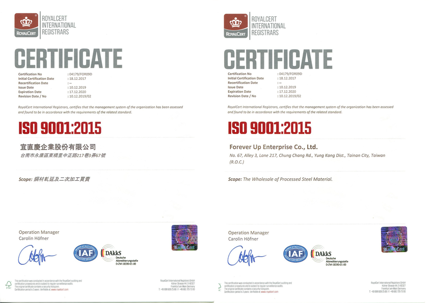 宜直慶於2005年榮獲ISO─9001認證登錄,努力不懈於提供良好的品質及服務來滿足客戶的需求。